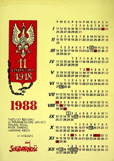 Kalendarz przedstawia po lewej stronie u góry kolejno: godło orła białego w koronie z krzyżem na czerwonym tle, zerwany łańcuch oraz datę 11 listopada 1918. Następnie czerwonym tłustym drukiem: 1988 oraz hasło w hołdzie Solidarności, na dole napis: Solidarność. Po prawej dni i miesiące w kolumnach pionowych.