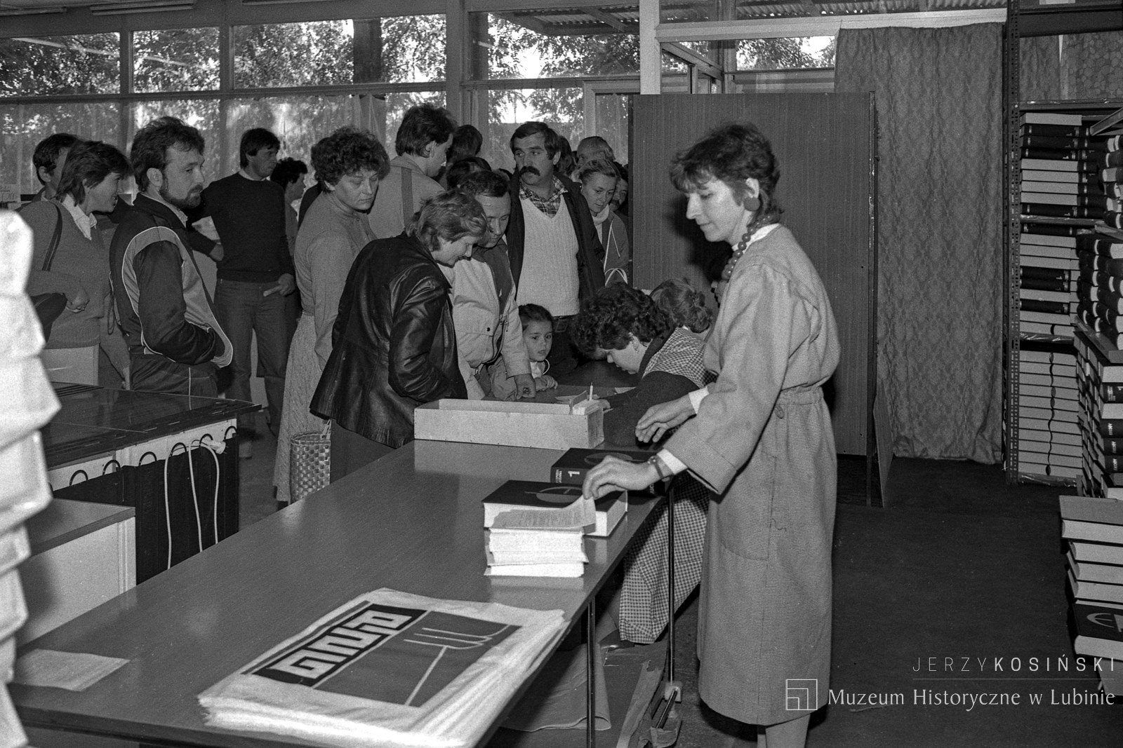 Czarno-biała fotografia pozioma przedstawia wnętrze sklepu. Na pierwszym planie stoi kobieta za ladą. Przed nią dwa egzemplarze encyklopedii. Za nią, też przy ladzie, dwie siedzące kobiety. Za plecami kobiet ułożone na półkach encyklopedie. Przed ladą kolejka.