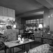 Czarno-biała fotografia przedstawia Klub MPiK (Międzynarodowej Prasy i Książki) w ratuszu. Widoczna kawiarnia klubowa; w tle za siedzącymi osobami oprawione egzemplarze gazet i czasopism dla czytelników.