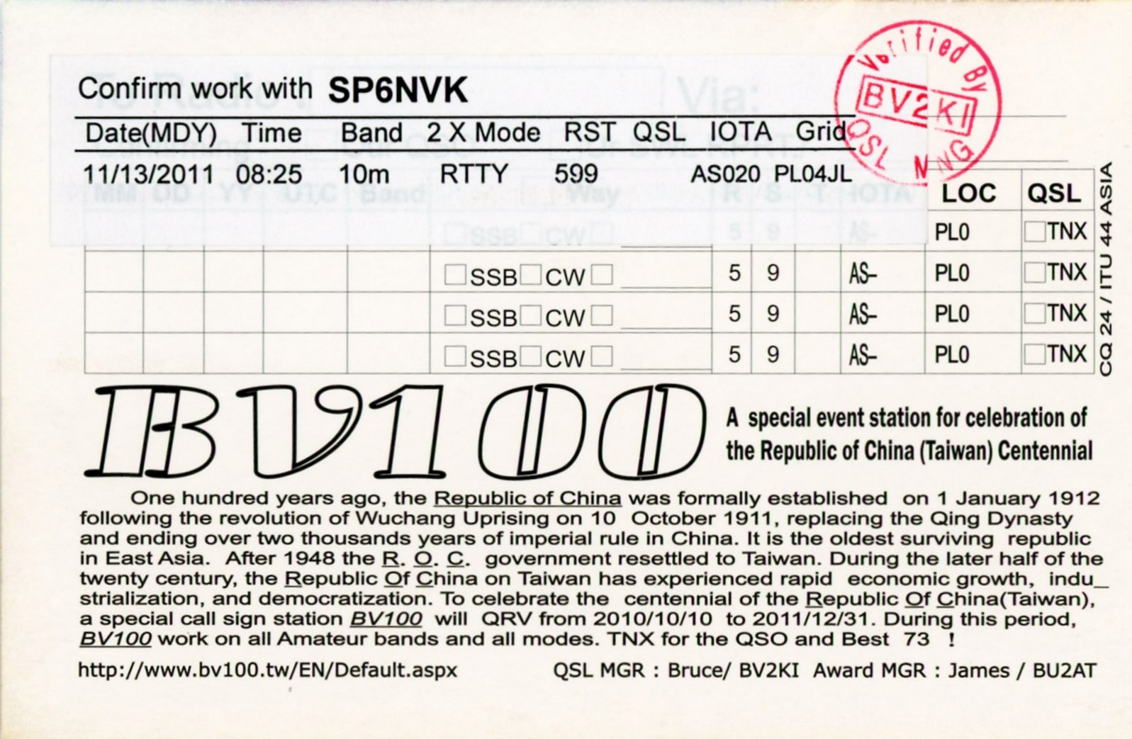 Karta QSL BV100 : Karta okolicznościowa 100 lat powstania Republiki Chin – Tajwanu : Tajwan : IOTA AS-020