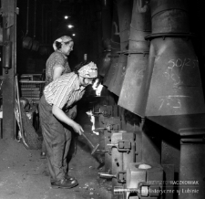 Czarno-biała fotografia przedstawia halę fabryczną. Na pierwszym planie dwie pracownice obsługujące piece do topienia metalu. Ubrane są w spodnie robocze oraz koszule z któtkim rekawem. Na głowach mają zawiązane chustki.