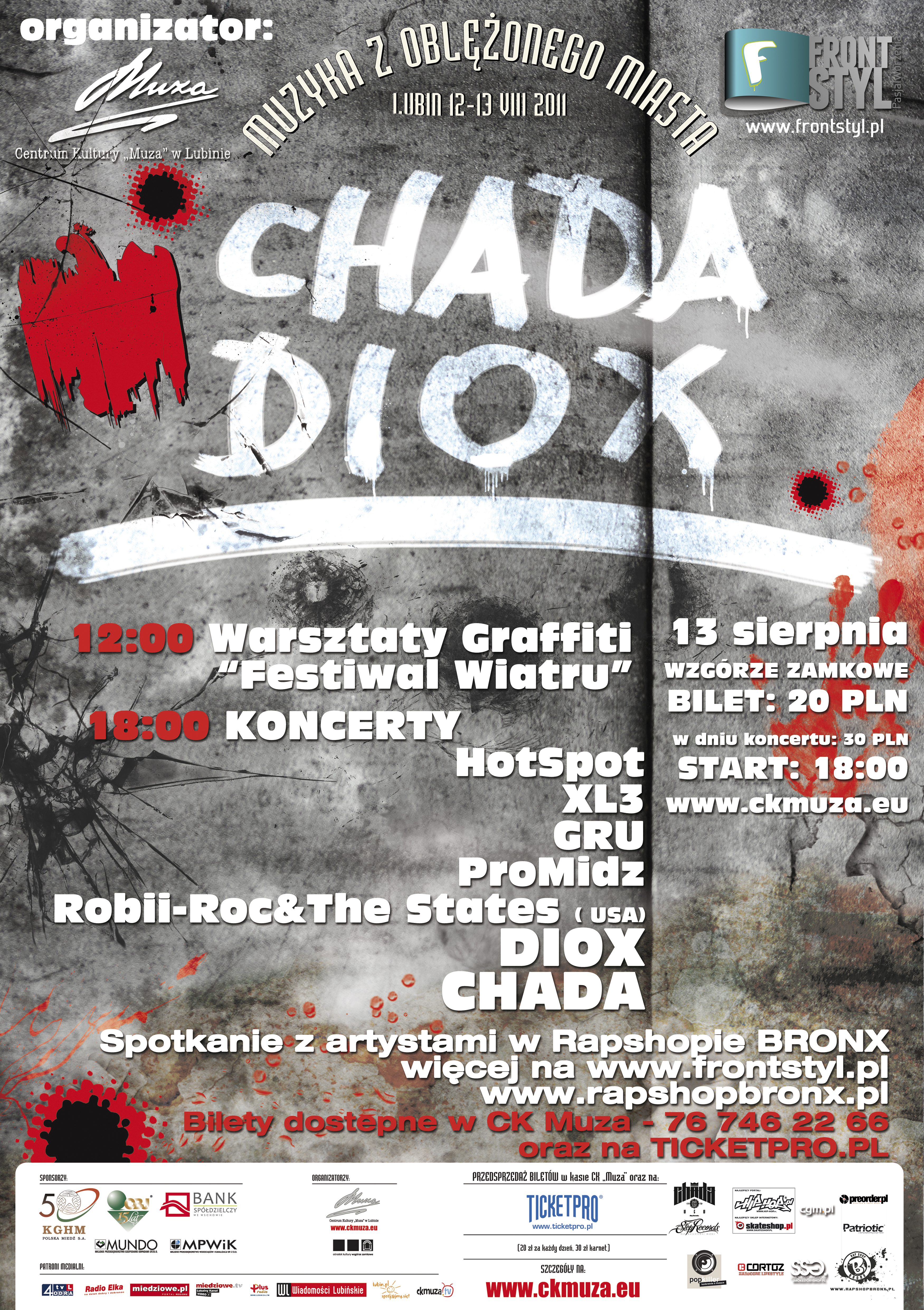 Pionowy szary afisz przedstawiający fragment szyby pękniętej od wystrzelonego z pistoletu pocisku i ślad po nim. U góry tekst tytułowy imprezy napisany – po górnym łuku – białą pogrubioną czcionką. Po lewej stronie widać czerwonego orła w koronie charakterystycznego dla Zbrodni Lubińskiej‘82. Równolegle do niego widnieje, jakby wymalowany szybko na ścianie grubym, ociekającym białą farbą pędzlem, tytuł koncertu. Jest on zamaszyście podkreślony grubą odręczną linią. Poniżej znajduje się szczegółowy plan imprezy w kolorach białym i czerwonym.