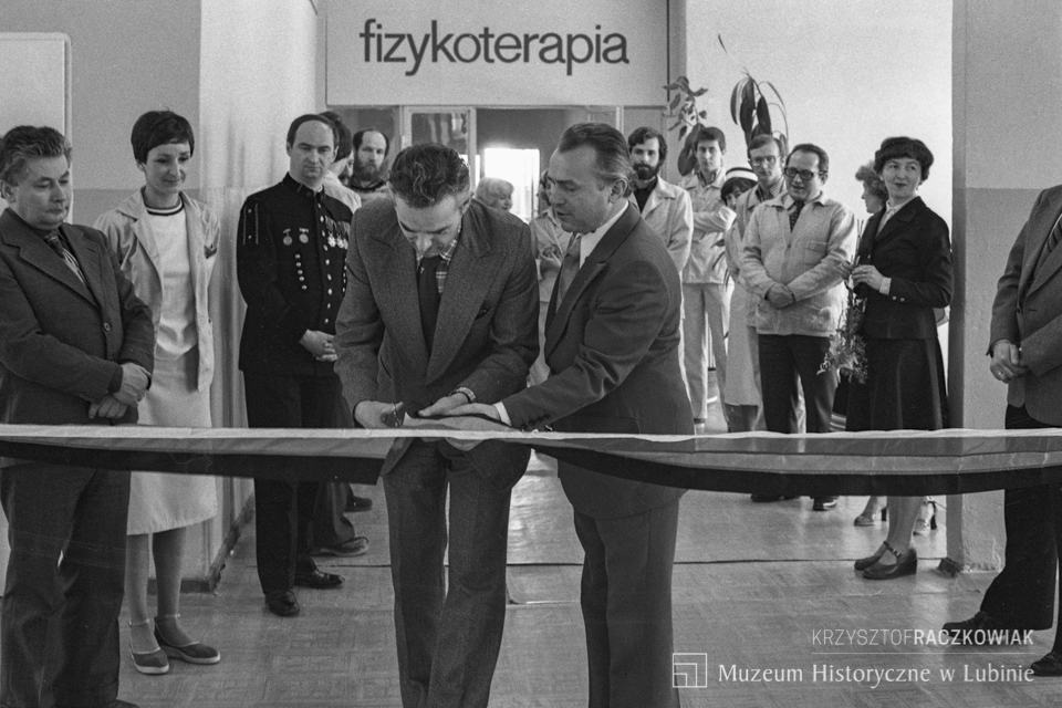Czarno-biała fotografia przedstawia dwóch mężczyzn w garniturach przecinających wstęgę na otwarcie oddziału fizykoterapii. Wokół stoi kilkanaście osób uczestniczących w ceremonii w szpitalnych ubiorach oraz jeden górnik w mundurze galowym. W tle napis: fizykoterapia.