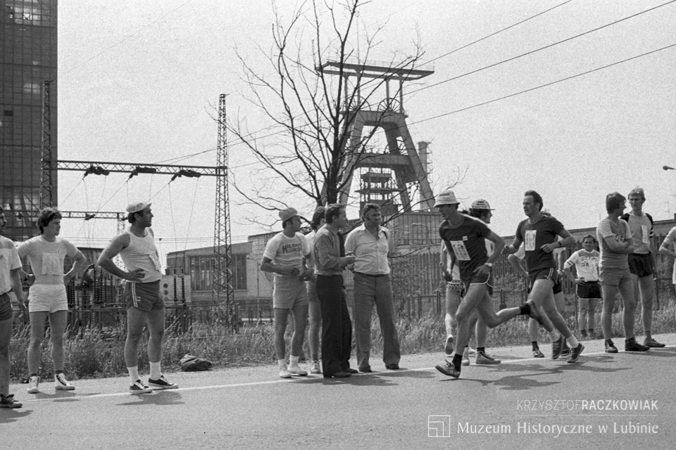 Czarno-biała fotografia przedstawia strefę zmiany biegu sztafetowego przy szybie głównym Zakładów Górniczych Lubin. Dwaj zawodnicy przebiegają, a reprezentanci innych zespołów oczekują na przekazanie pałeczek. W tle wieże wyciągowe szybów L-1 i L-2.