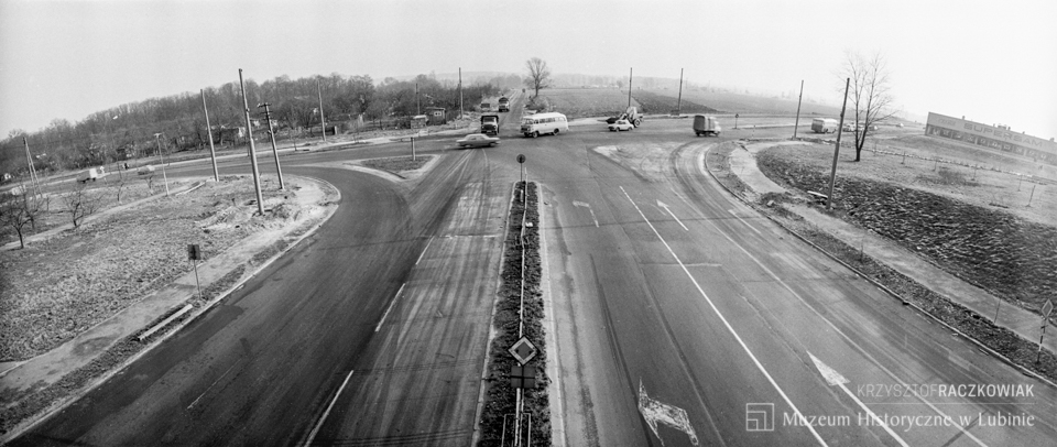 Czarno-biała fotografia przedstawia widok skrzyżowania ulic Komisji Edukacji Narodowej i Paderewskiego. Zdjęcie wykonano z kładki dla pieszych. W oddali ogrody działkowe oraz pawilon handlowy.