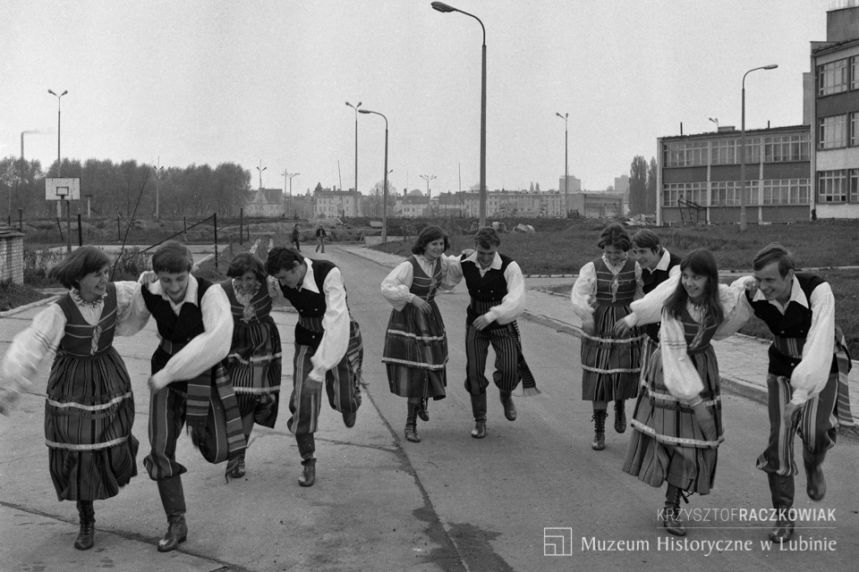 Czarno-biała fotografia przedstawia zespół folklorystyczny w strojach regionalnych, tańczący na ulicy przed Zespołem Szkół Górniczych.