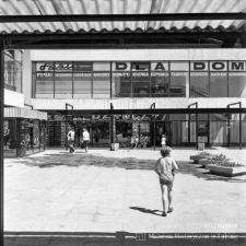 Czarno-biała fotografia przedstawia plac przed obiektami handlowymi. Przed sklepem spożywczym stoi kilkoro dzieci i wózki. Na pierwszym planie kilkuletni chłopiec ubrany tylko w krótkie spodenki.