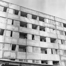 Czarno-biała fotografia przedstawia wybudowany blok, w którym trwają prace wykończeniowe. Na jednym z balkonów pracownik tynkuje ściany.