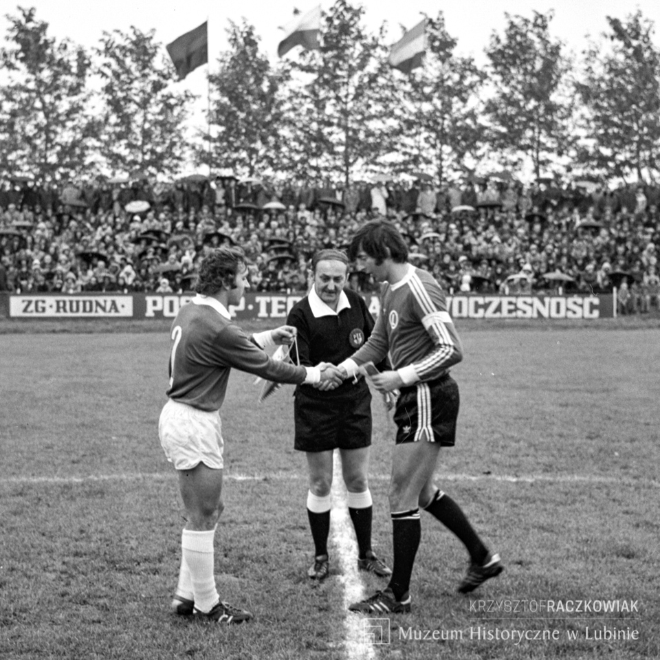 Czarno-biała fotografia przedstawia moment wymiany proporczyków przez kapitanów drużyn – po prawej Kazimierz Deyna.