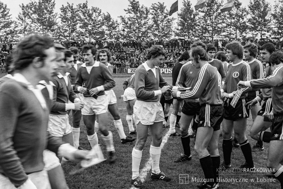 Czarno-biała fotografia przedstawia wymianę proporczyków i upominków przez zawodników dwóch drużyn piłkarskich po meczu. W tle trybuny wypełnione kibicami.
