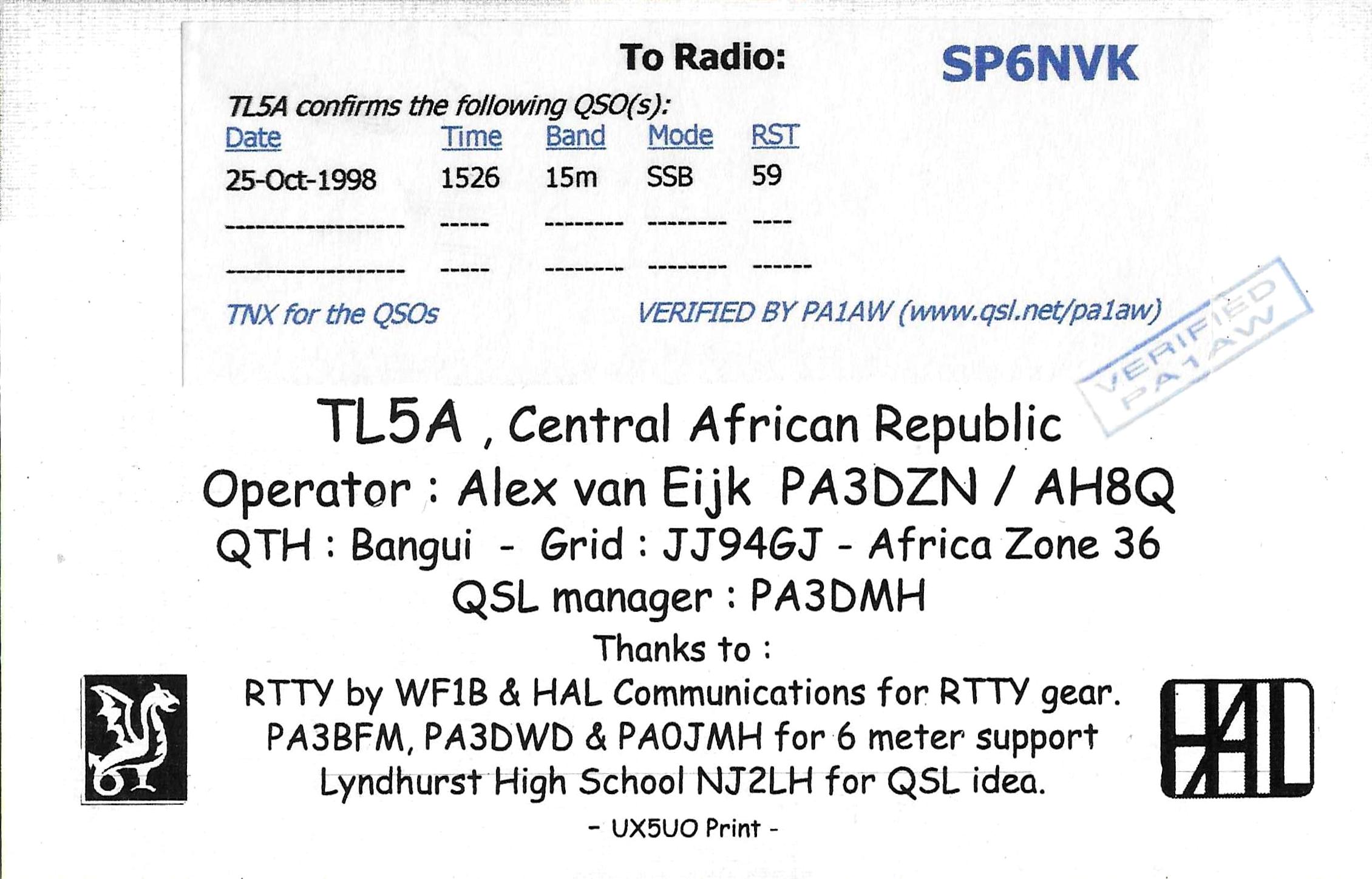 Karta QSL TL5A : Republika Środkowoafrykańska