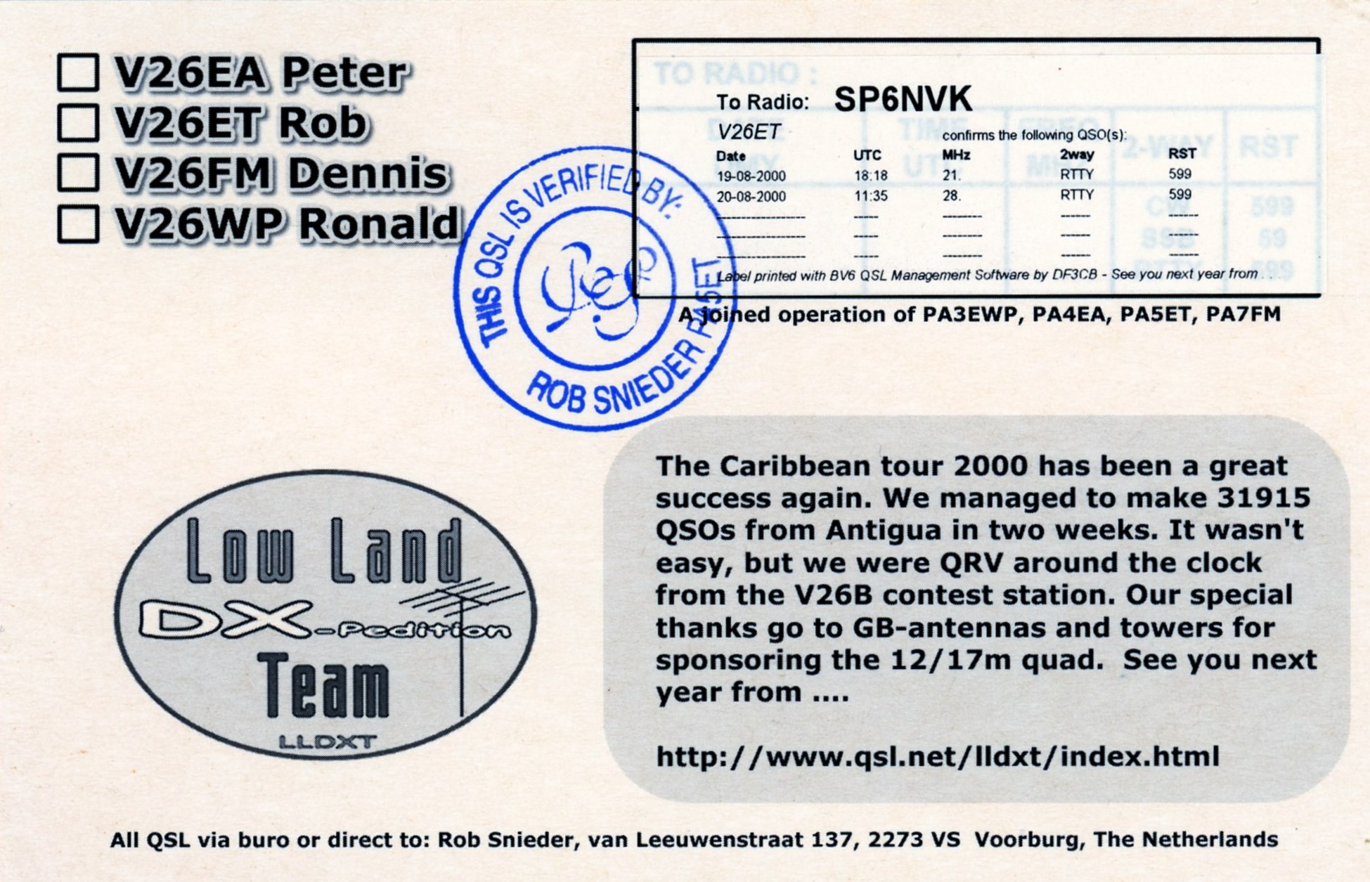 Karta QSL V26ET : Antigua i Barbuda : IOTA NA-100