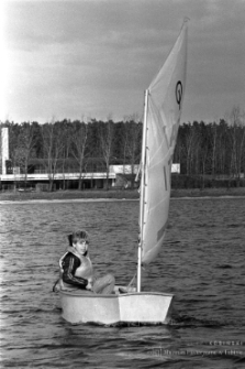 Czarno-biała fotografia przedstawia chłopca w żaglówce na zalewie Małomickim. W tle budynki i drzewa.