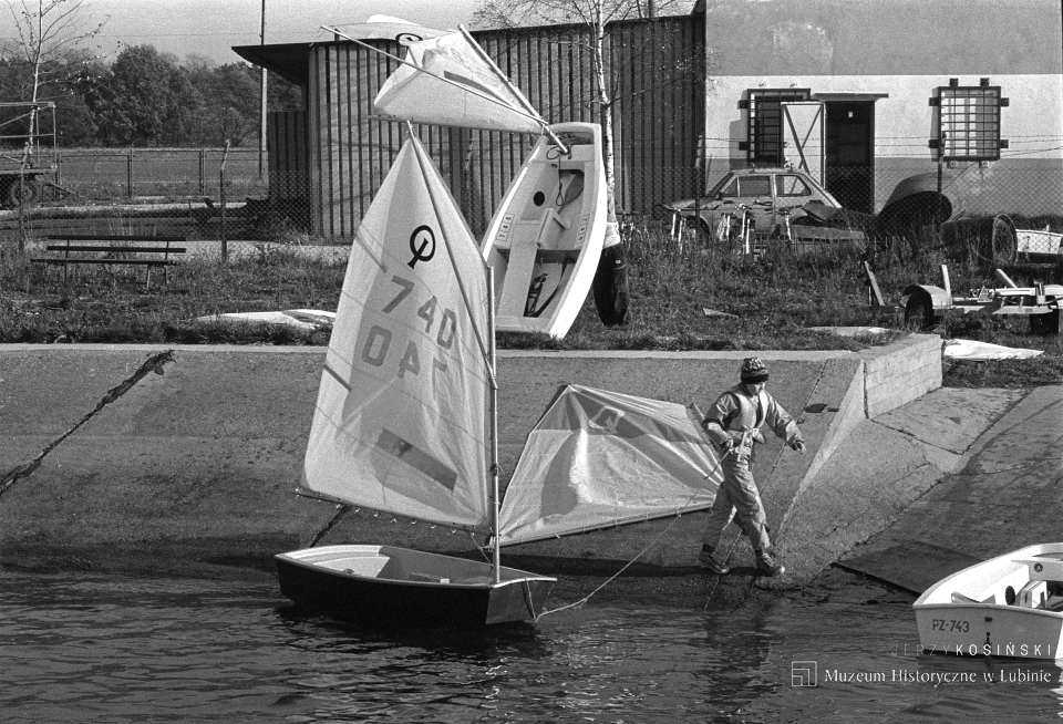 Czarno-biała fotografia przedstawia chłopca wciągającego na betonowy brzeg żaglówkę. W tle budynek klubu Chalkos.