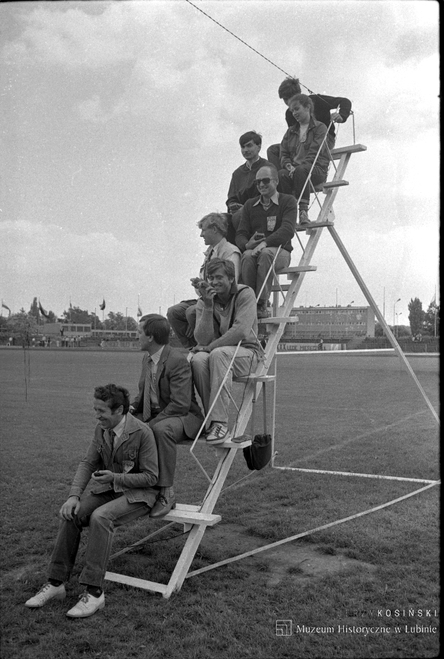 Czarno-biała fotografia przedstawia uśmiechniętych ludzi siedzących na pionowych schodkach na murawie boiska.