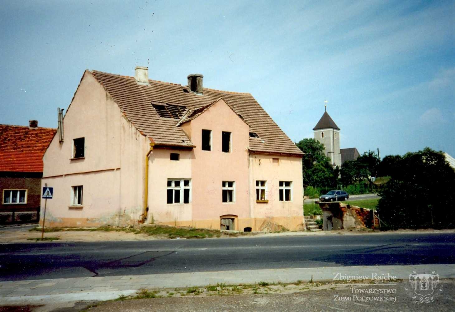 Opis:Kolorowa fotografia przedstawia parterowy dom z poddaszem i piwnicą usytuowany po prawej stronie ulicy Małej przy poboczu ulicy Dąbrowskiego. Za budynkiem, po lewej stronie w dół ulicy Małej jedzie ciemnoniebieski samochód osobowy. W tle, na błękitnym niebie z białymi delikatnymi strzępkami chmur, wśród drzew widać wieżę i dach kościoła rzymskokatolickiego pw. św. Michała Archanioła.