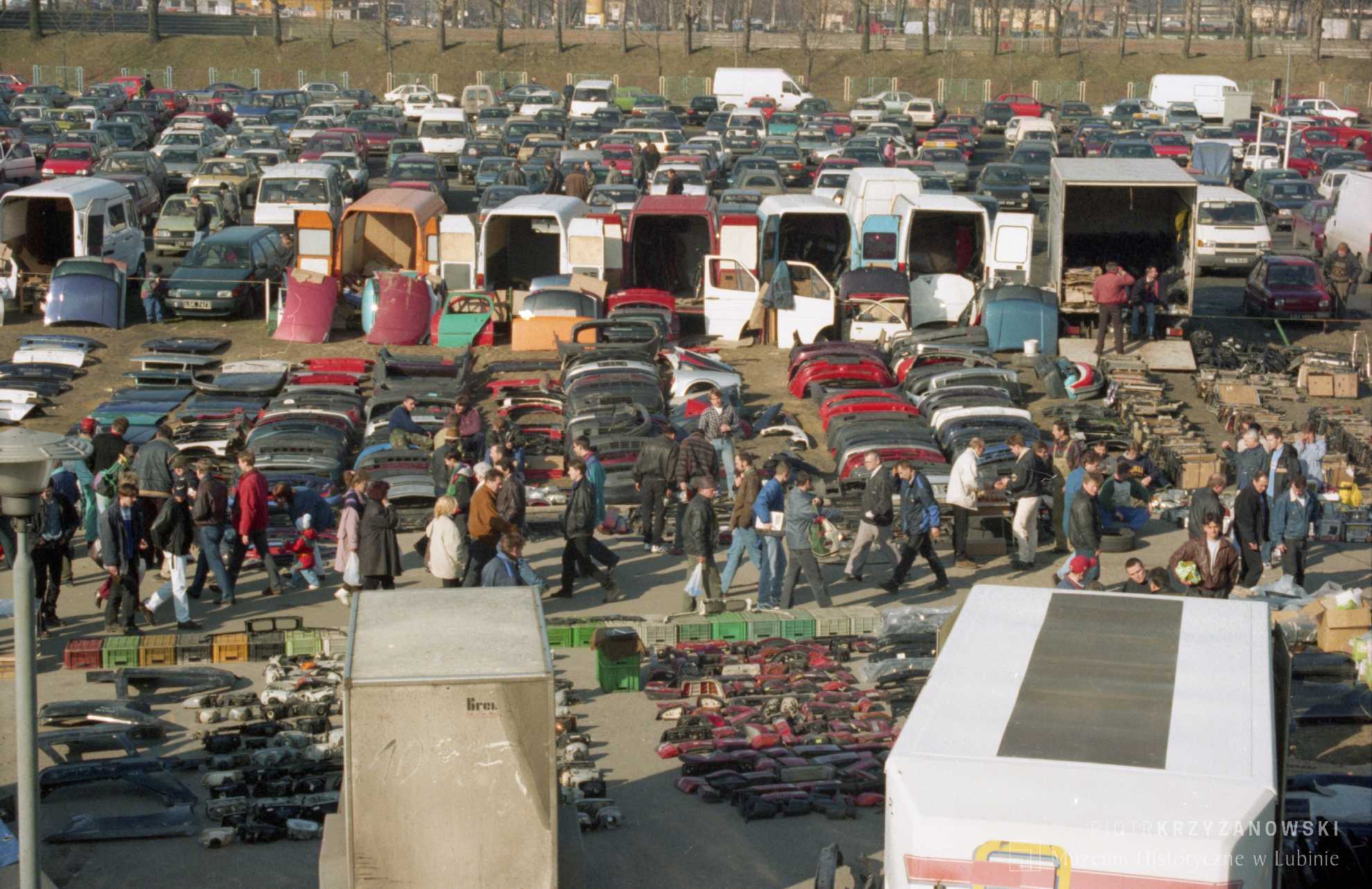Kolorowe fotografie przedstawiają giełdę samochodową odbywającą się co sobotę, a jeszcze wcześniej także w każdą niedzielę przy stadionie Zagłębia Lubin.