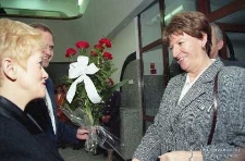Kolorowe fotografie przedstawiają Hannę Suchocką we wnętrzu przekazywanego do użytku publicznego nowego budynku sądu przy ulicy Wrocławskiej.
