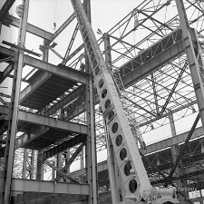 Czarno-białe fotografie przedstawiają głogowską hutę miedzi z zewnątrz.