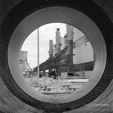 Czarno-białe fotografie przedstawiają głogowską hutę miedzi z zewnątrz.