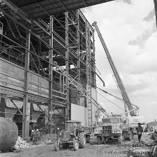 Czarno-białe fotografie przedstawiają głogowską hutę miedzi z zewnątrz.