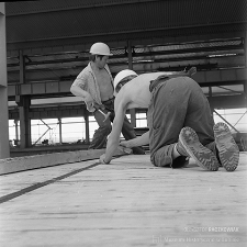 Czarno-białe fotografie przedstawiają pracowników przy budowie hal produkcyjnych na terenie Huty Miedzi „Głogów II” w 1977 roku.