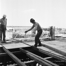 Czarno-białe fotografie przedstawiają pracowników przy budowie hal produkcyjnych na terenie Huty Miedzi „Głogów II” w 1977 roku.