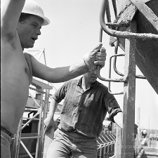Czarno-białe fotografie przedstawiają pracowników przy budowie hal produkcyjnych na terenie Huty Miedzi „Głogów II” w 1977 roku.