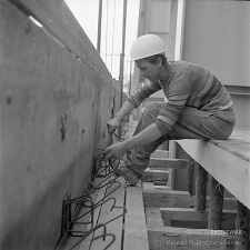 Czarno-białe fotografie przedstawiają pracowników przy budowie hal produkcyjnych na terenie Huty Miedzi „Głogów II” w 1977 roku.