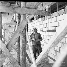 Czarno-białe fotografie przedstawiają pracowników przy budowie hal produkcyjnych na terenie Huty Miedzi „Głogów II” w 1977 roku.