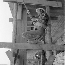 Czarno-białe fotografie przedstawiają pracowników przy budowie hal produkcyjnych na terenie Huty Miedzi „Głogów II” w 1977 roku.