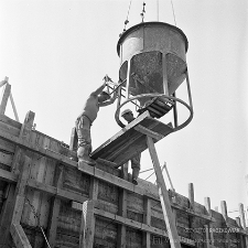 Czarno-białe fotografie przedstawiają pracowników przy budowie hal produkcyjnych na terenie Huty Miedzi „Głogów II” w 1977 roku.
