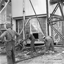 Czarno-białe fotografie przedstawiają pracowników przy budowie hal produkcyjnych na terenie Huty Miedzi „Głogów II” w 1977 roku.