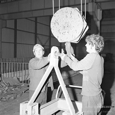 Czarno-białe fotografie przedstawiają pracowników przy budowie hal produkcyjnych na terenie Huty Miedzi „Głogów II” w 1977 roku.