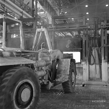 Czarno-białe fotografie przedstawiają wnętrza hal huty miedzi i ich budowę.