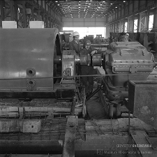 Czarno-białe fotografie przedstawiają wnętrza hal huty miedzi i ich budowę.