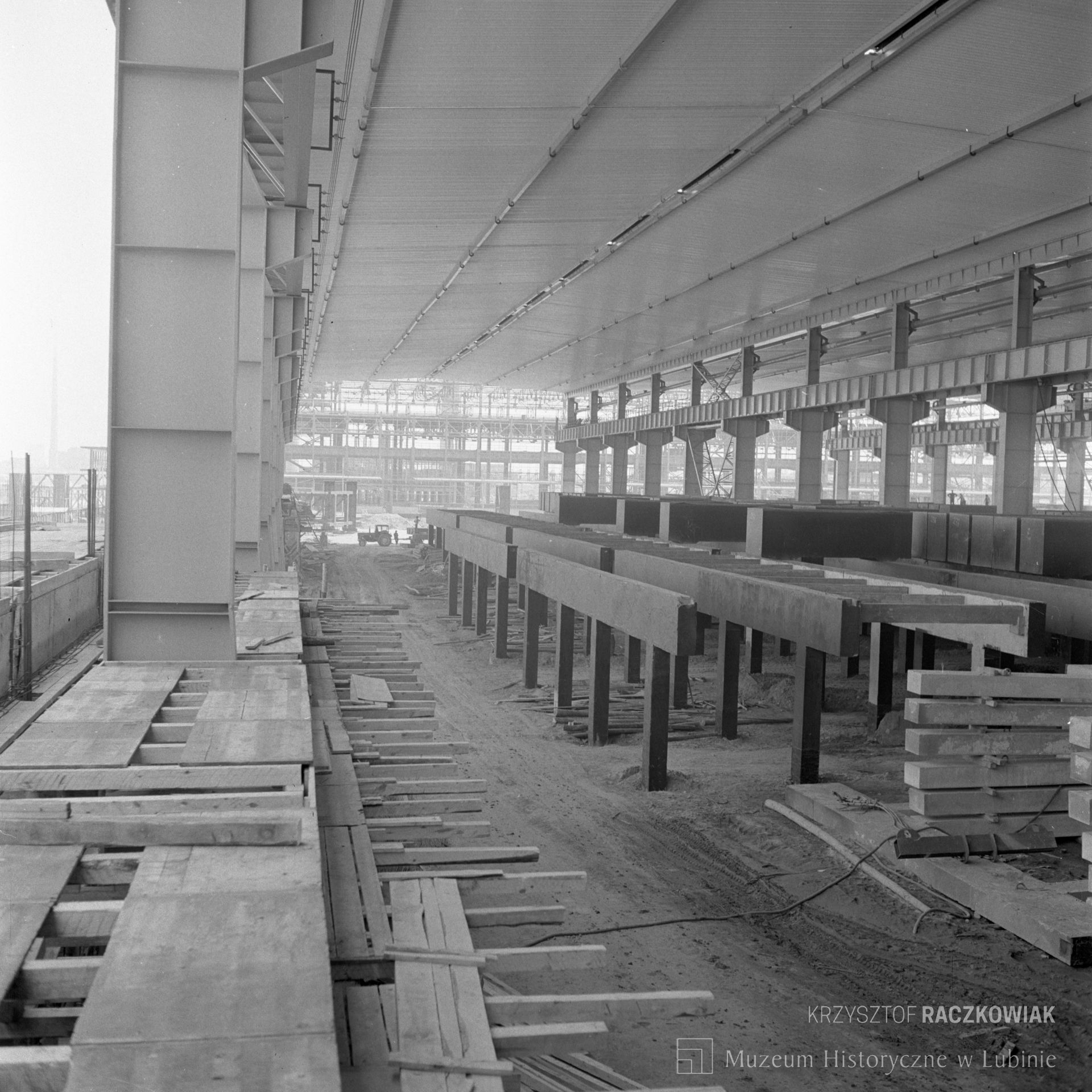 Description:Czarno-białe fotografie przedstawiają wnętrza hal huty miedzi i ich budowę.