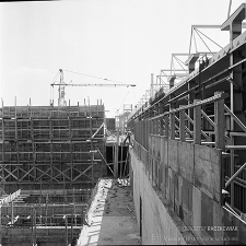 Czarno-białe fotografie przedstawiają wnętrza hal huty miedzi i ich budowę.