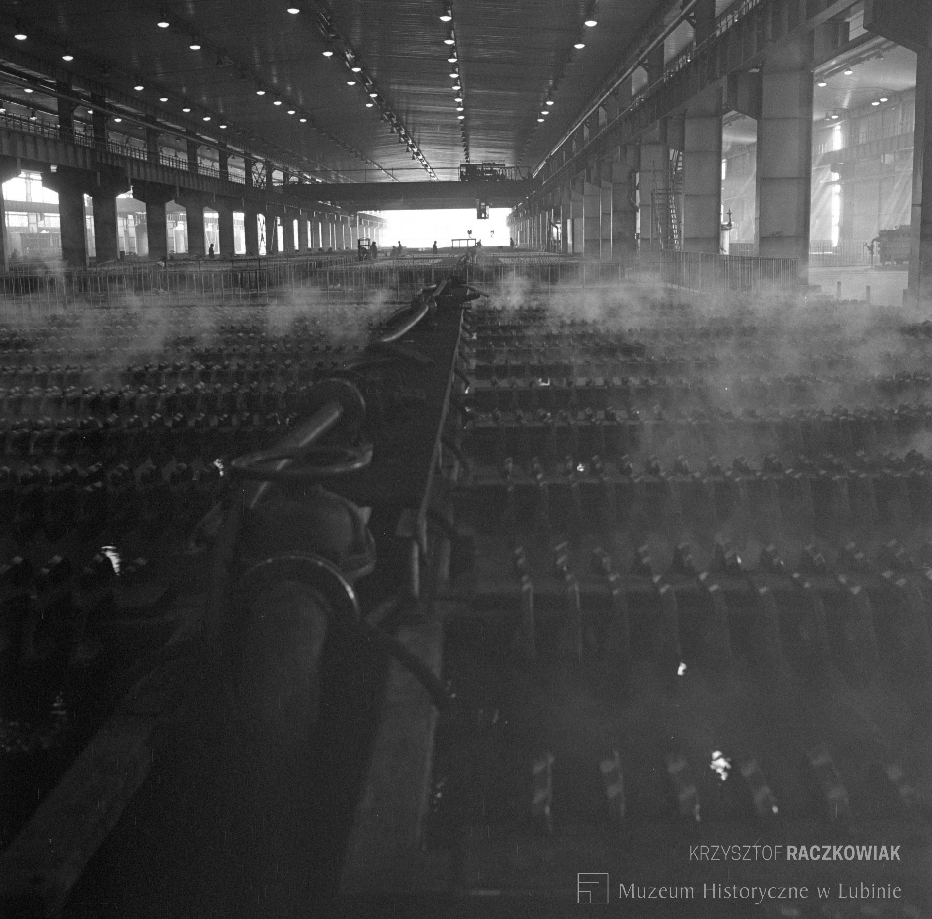 Czarno-białe fotografie przedstawiają wnętrza hal huty miedzi i ich budowę.