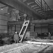 Czarno-białe fotografie przedstawiają wnętrza hal huty miedzi i ich budowę.