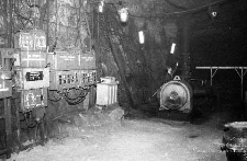 Czarno-białe fotografie przedstawiają pompy górnicze i urządzenia odwadniające na dole kopalni.