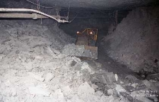 Kolorowa fotografia przedstawia wybieranie urobku z chodnika w Zakładach Górniczych „Lubin”.