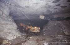 Kolorowa fotografia przedstawia wybieranie urobku z chodnika w Zakładach Górniczych „Lubin”.