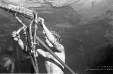 Czarno-białe fotogrfie przedstawiają górników podczas pracy na dole kopalni Zakładów Górniczych „Lubin”.