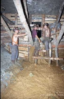 Kolorowy fotoreportaż przedstawia pracę górników wykonywaną w czasie jednej zmiany na dole w kopalni.