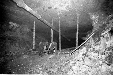 Czarno-białe fotografie przedstawiają wiertnicę górniczą oraz prace na przodku na dole kopalni.