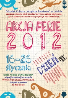 Plakat towarzyszył zorganizowanym przez Ośrodek Kultury „Wzgórze Zamkowe” dla dzieci i młodzieży feriom zimowym. Zawiera informacje dotyczące planu zajęć w dniach 16 – 26 stycznia 2012 roku.