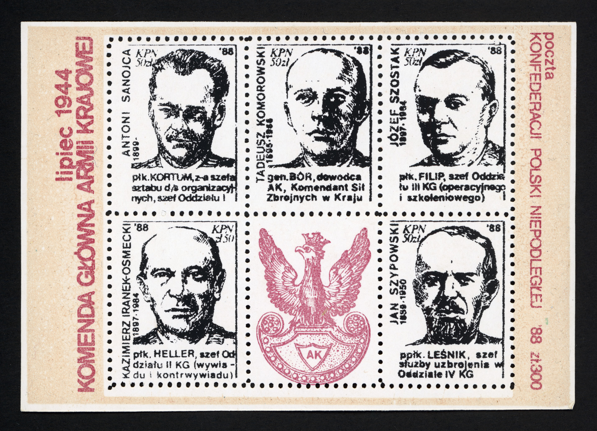 Blok pięciu znaczków ząbkowanych o nominałach 50 zł. Widnieją na nich kolejno: Antoni Sanojec 1895–, płk Kortum, z-ca szefa sztabu d/s organizacyjnych, szef Oddziału I, Tadeusz Komorowski 1895–1966, gen. Bór, dowódca AK, Komendant Sił Zbrojnych w Kraju, Józef Szostak 1897–1964, płk Filip, szef Oddziału III KG (operacyjnego i szkoleniowego), Kazimierz Iranek–Osmecki 1897–1984, płk Heller, szef Oddziału II KG (wywiadu i kontrwywiadu), Jan Szypowski 1889–1950, ppłk Leśnik, szef służby uzbrojenia w Oddziale IV KG.