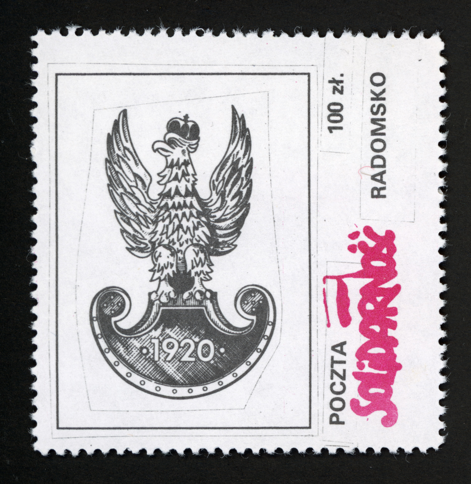 Na znaczku Polski orzeł w koronie, u dołu 1920. Po prawej w pionie napis: poczta, Solidarność (w kolorze czerwonym), Radomsko. Znaczek seryjny, ząbkowany, o nominale 100 zł.