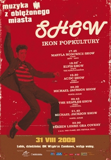 Czerwono-brązowy afisz pionowy. Po lewej stronie od góry – napisany pogrubioną białą czcionką – znajduje się delikatnie przekrzywiony tekst z nazwą imprezy. Umiejscowiony jest on w jednej linii z białym charakterystycznym dla Zbrodni Lubińskiej‘82 orłem w koronie. Prawą stronę wypełnia szczegółowy program imprezy w białym kolorze, lewą – brązowa sylwetka tańczącego Elvisa Presleya. Poniżej, na brązowej części plakatu, umieszczono datę w żółtym kolorze i miejsce koncertu w białym. Całość stylizowana jest na zniszczoną częstym używaniem okładkę poczytnej książki.